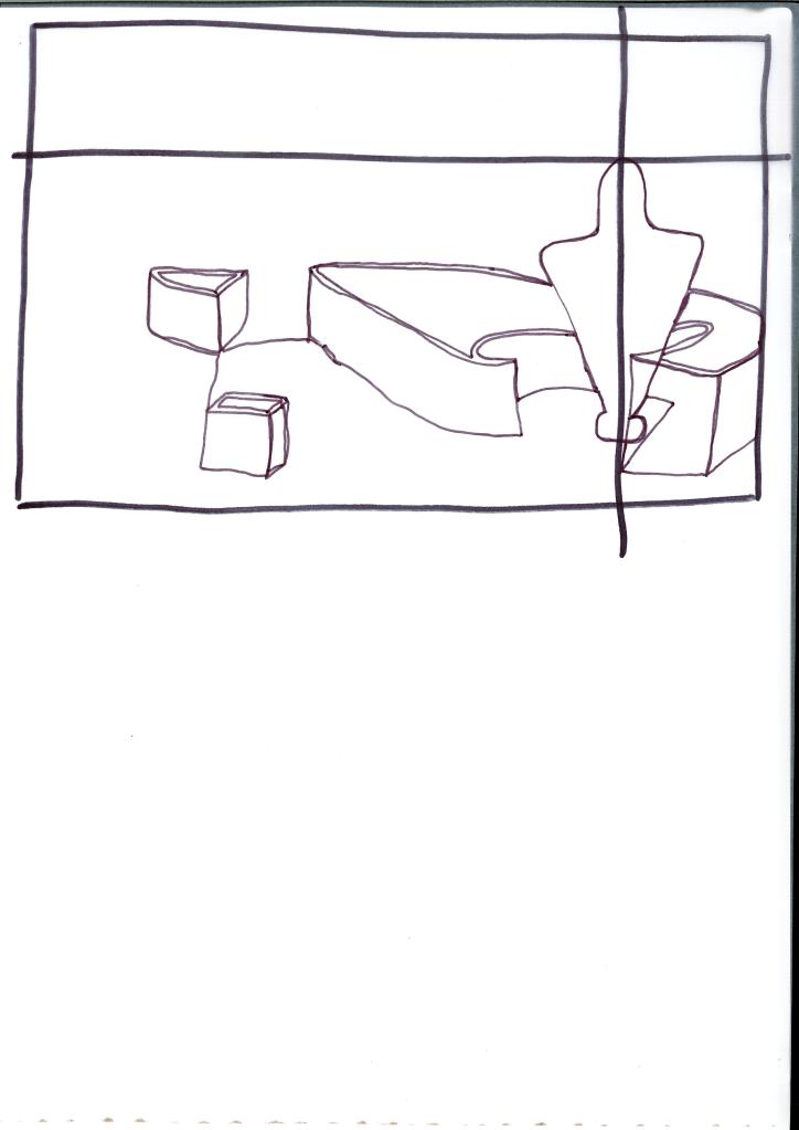 Although I identified I need to work on my “person-drawing” techniques, I can see a depth of perspective in my lateral view. There is the larger fragment of the pond, wrapping around the “person”, alongside the smaller fragments getting further away to the left.