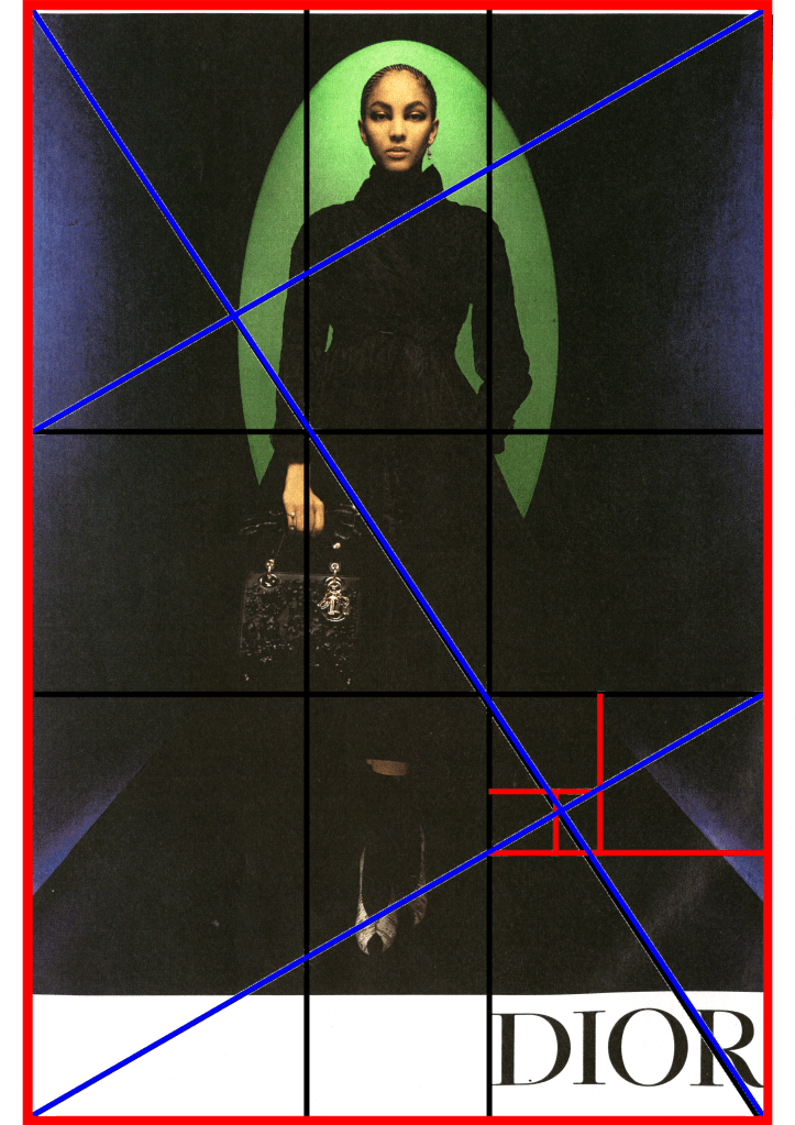 If we look at the placement of the picture, we can see it is set exactly to the golden rectangle and triangle (highlighted in black and blue). The golden rectangle is significant, creating a harmonic and visually appealing image. The ratio of the rectangle is 1:1.618, which suggests subconscious harmony and balance. (3)