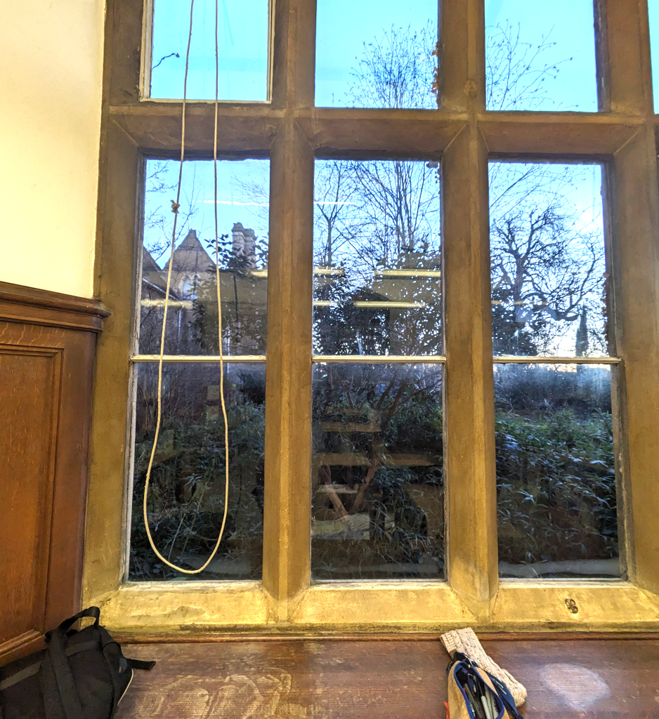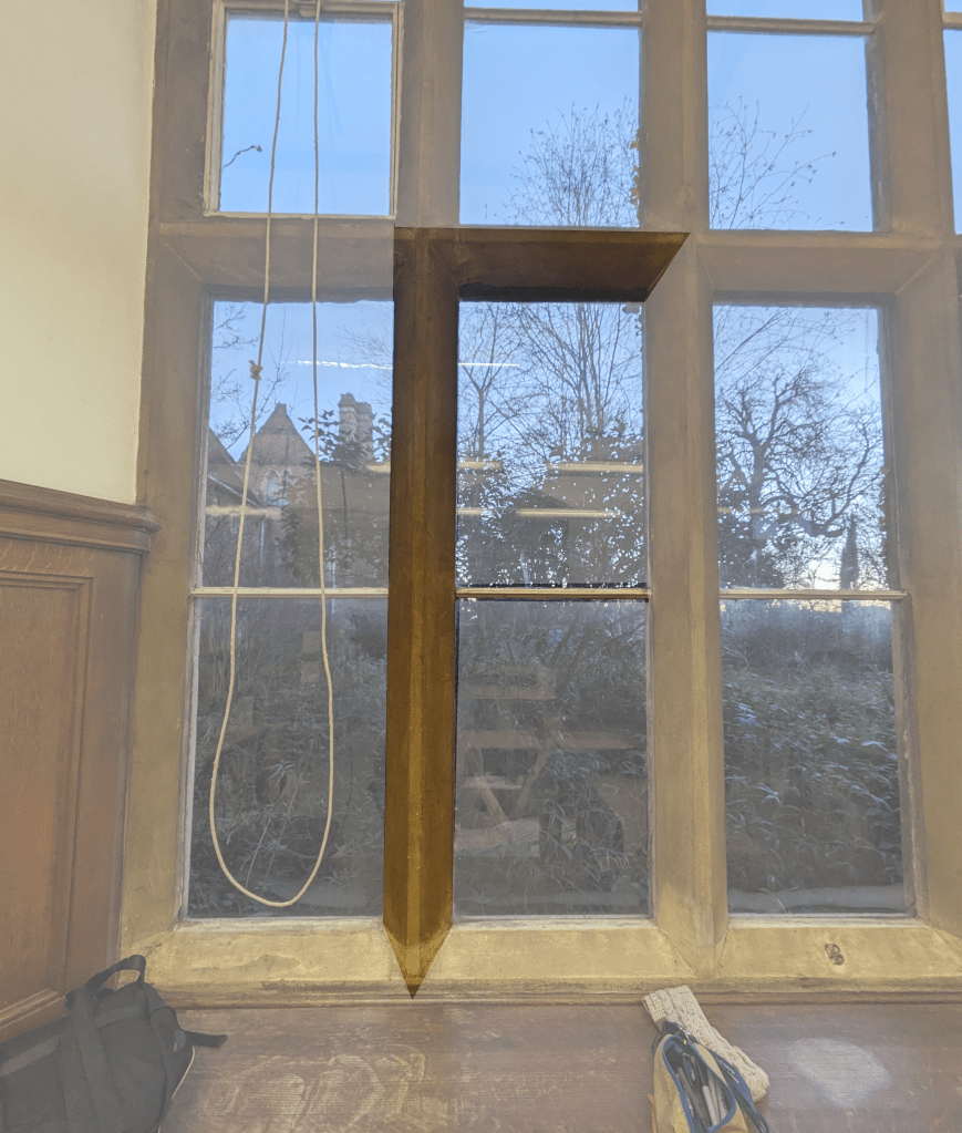 I discovered the F hiding in the stone frames in the Library. It was visible due to the pointed ends of the cut stone creating the arms and stem of the letter.