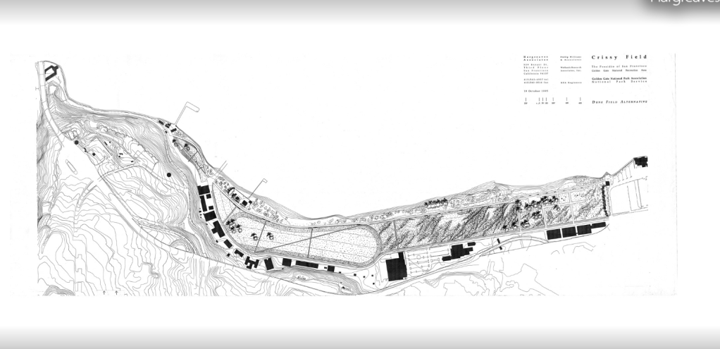 In the Crissy Field, Hargreaves’s design reinstates the areas’ natural and manmade features, enhancing its genus loci. There are various and diverse recreational areas that enable the user to find a space that suits their want at that time. This diversity and its key location create great opportunity and a chance the site will be a popular location. The topography is flats, and Hargreaves was sensitive to not installing a vast overengineered “art project” design.