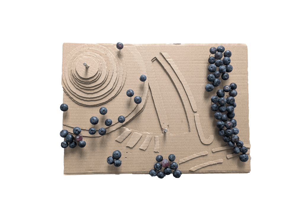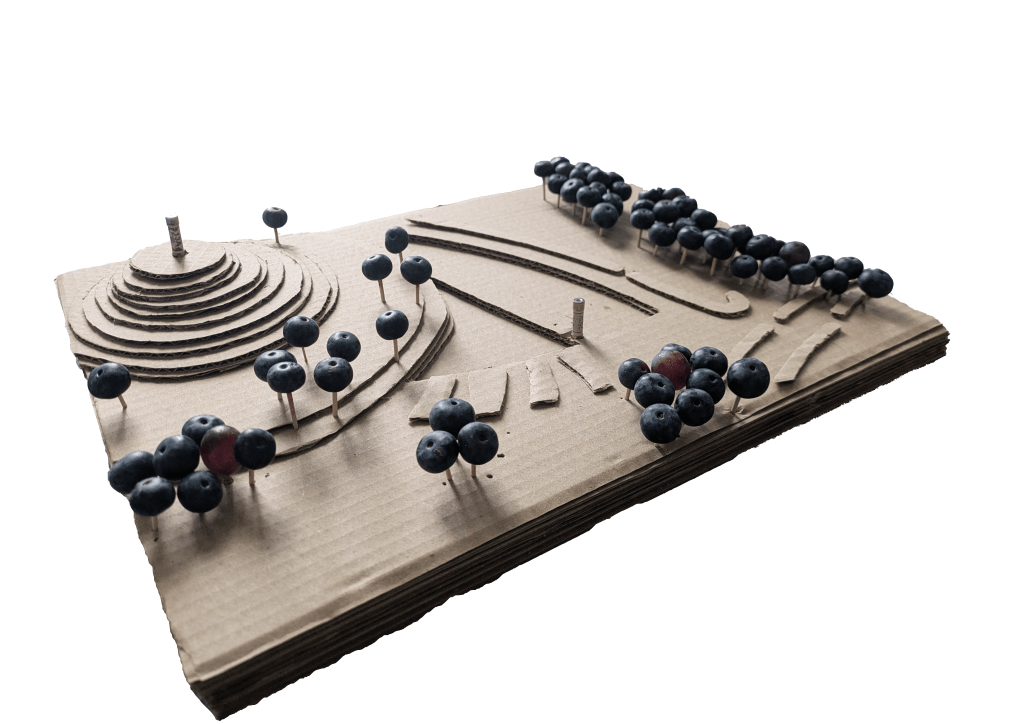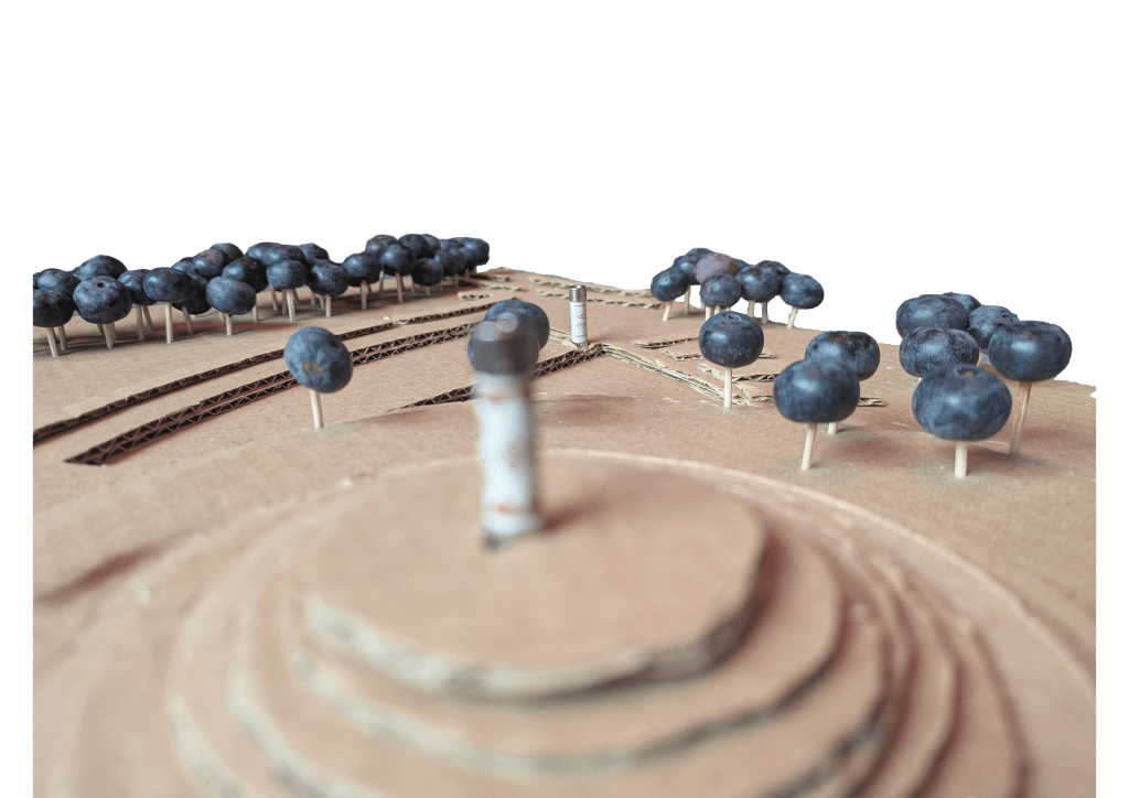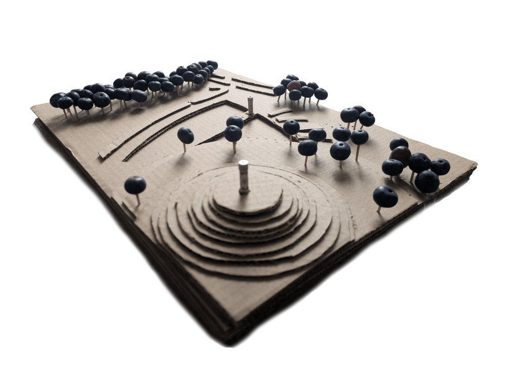 This design includes key sightlines that guide an experience of moving through the landscape, which I’ve tried to show with the gaps between the blueberry trees. As a qualified electrician, I couldn’t resist incorporating some old fuses I had lying around and they turned out to be surprisingly effective in representing the obelisks.