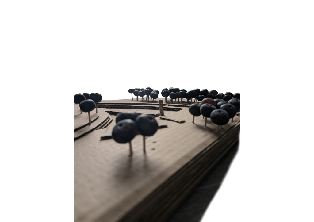 The model is built to a 1:500 plan scale, though the physical elements aren’t strictly scaled in 3D. Still, the overall form, especially the mounding, communicates the intended spatial experience quite well. Unfortunately, I wasn’t able to access the model-making studio or laser cutter, so the edges are a bit rough. That said, I think the simplicity gives the model a certain charm, and the use of unconventional materials adds a layer of ingenuity and individuality that I’m proud of.